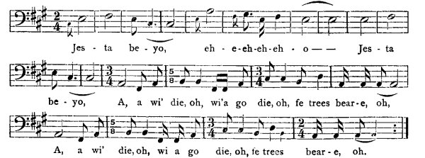 A, a wi' die, oh, wi'a go die, oh, fe trees bear-e, oh,