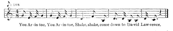There was a bird Arinto; it used to feed on human flesh. In the district there was a little boy by the name of David Lawrence who was lame in both feet. When the boy heard the bird fly, he asked his sister to take him; but she refused, saying if she remained Arinto would eat her too. The boy, having no other resource, dug a hole in the ground where he lived for some time. When the bird came and perched on the house-top, he said, "Smell flesh; somebody about here!" Then David Lawrence sang,