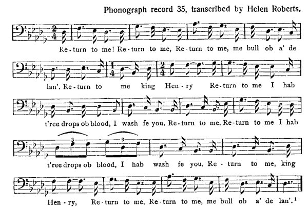 Re--turn to me, king Hen--ry, Re--turn to me, Re--turn to me, me bull ob a' de lan'.[1]