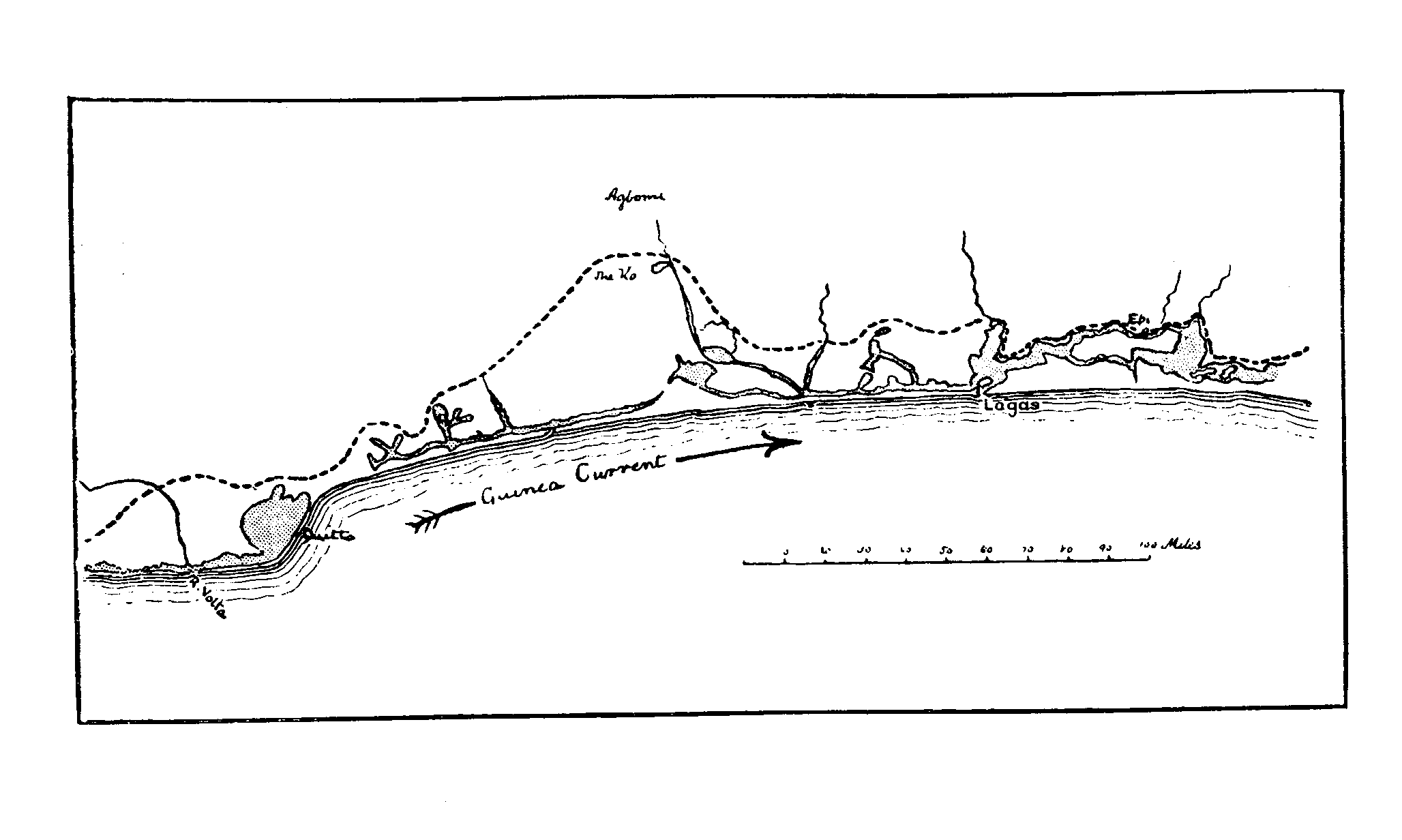 The lagoon system, which in the last volume of this series was noted as commencing a short distance to the west of the Volta River, on the Gold Coast, extends along the whole sea-front of the territory occupied by the Yoruba-speaking tribes, and affords a continuous waterway from Porto Novo to Benin. The extension of the continent in a southerly direction, which was mentioned in the last volume as typical of the western half of the Slave Coast, and which may doubtless be attributed to the action of the Guinea current in closing with sand the openings to former indentations which existed in the coast-line, is also equally noticeable in this the eastern half of the Slave Coast; and, generally speaking, the country is open, flat, and devoid of stones. Jebu is an excep tion, being thickly forested; but it appears that less territory has been won from the sea south of Jebu, and cast of Lagos generally, than in the districts to the west, between Lagos and Dahomi. To the east of Lagos the old coast-line seems to have been almost conterminous with the northern shores of the Kradu and Lekki lagoons, and the water-way which connects them by way of Epi, while to the west it appears to have trended back northwards bevond the lagoons of Oluge and Porto Novo. It is only after crossing the narrow lagoon or creek called the Ajarra Creek, which runs in a convex curve from the Porto Novo lagoon to the Okpara, that stones are found in the soil; and about twenty miles to the west of this there appears to have been at one time a great bay, the northern limit of which was the Ko, or Great Marsh, of Dahomi, thirty-five iniles from the present coastline. The dotted line in the accompanying map shows the probable position of the ancient coast-line between the Volta River and Lekki.
