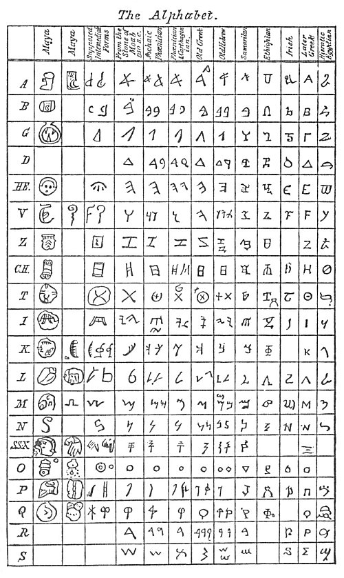 It is a surprising fact that we find in Central America a phonetic alphabet. This is in the alphabet of the Mayas, the ancient people of the peninsula of Yucatan, who claim that their civilization came to them across the sea in ships from the east, that is, from the direction of Atlantis. The Mayas succeeded to the Colhuas, whose era terminated one thousand years before the time of Christ; from them they received their alphabet. It has come to us through Bishop Landa, one of the early missionary bishops, who confesses to having burnt a great number of Maya books because they contained nothing but the works of the devil. He
