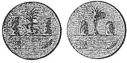 of a copper coin, two inches in diameter and three lines thick, found nearly a century ago by Ordonez, at the city of Guatemala. "M. Dupaix noticed an indication of the use of the compass in the centre of one of the sides, the figures on the same side representing a kneeling, bearded, turbaned man between two fierce heads, perhaps of crocodiles, which appear to defend the entrance to a mountainous and wooded country. The reverse presents a serpent coiled around a fruit-tree, and an eagle on a hill." (Bancroft's "Native Races," vol. iv., p. 118.) The mountain leans to one side: it is a "culhuacan," or crooked mountain.