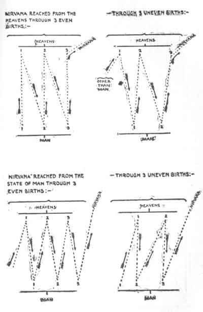 (except in very rare cases) as an advance in straight lines, but as an advance by undulations,--a psychical rhythm of motion. This is exemplified by the curious Buddhist classification of the different short courses by which the Kwan or revenants may hope to reach Nirvana. These short courses are divided into Even and Uneven;--the former includes an equal number of heavenly and of earthly rebirths; while in the latter class the heavenly and the earthly intermediate rebirths are not equal in number. There are four kinds of these intermediate stages. A Japanese friend has drawn for me the accompanying diagrams, which explain the subject clearly.