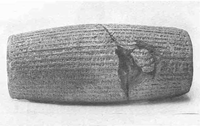 Baked clay cylinder inscribed with an account of the capture of Babylon by Cyrus (cuneiform KU-RA-ash) King of Persia, 538 B.C. He restored to their original shrines throughout the country the images of the gods which a former king Nabonidus had collected in Babylon and gave the Jews permission to rebuild their temple. (British Museum No. 90920.). (See page 190.)
