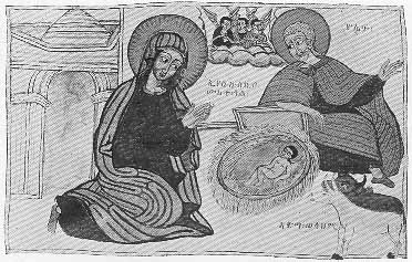 The Nativity. "Jesus lying in a manger" edged with straw. Above, on clouds, are the angels of heaven; on the right, the ass and the ox which wamed the stable with their breath
