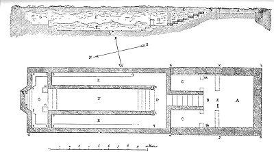 A. Pronaos with colonnade.--B. Entrance to stairway.--CC. Sacristy (apparatorium?)--D. Vestibule.--E. Benches ranged along the sides.--F. Space reserved for celebrants.--G. Apse containing the sacred images. (T. et M., p. 370.)