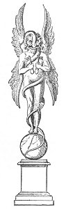 Nude leontocephalous figure standing upright on a globe; in each hand a key; four wings; thrice entwined by a serpent, the head of which passes over the skull and is about to enter the mouth. Sketched by Bartoli from a description found in a mithræum discovered in the 16th century in Rome, between the Quirinal and the Viminal. (T. et. M., Fig. 21, p. 196.)
