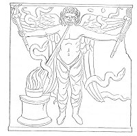 Bas-relief of white marble. Found in the same mithræum as the statue of Figure 22. Naked to the waist; the limbs clothed in wide trousers; the arms extended; and in each hand a torch. From the back four wings issue, two pointing upwards and two downwards, and around each is a serpent. Before the god is a circular burning altar, and from his mouth a band representing his breath extends to the fire of the altar. (T. et M., Fig. 22, p. 196.)
