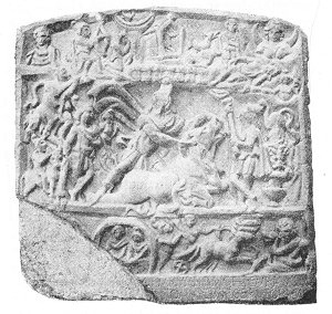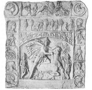 Showing scenes from the life of Mithra. Among them Mithra crowning the sun-god with a radiate halo, his ascension in the solar chariot to Heaven, and his smiting the rock from which the waters flowed. (T. et. M., p. 336)