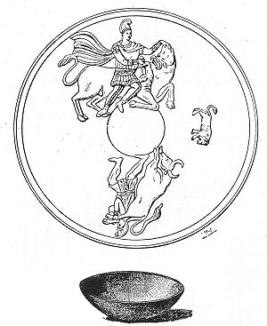 In the center, the tauroctonous Mithra with the two torch-bearers; to the left, Mithra mounted on the bull, and Mithra taurophorous; to the right, a lion stretched lengthwise above a cup (symbols of fire and water). Upper border: Bust of Luna; new-born Mithra reclining near the banks of a stream; shepherd standing, with lambs; bull in a hut and bull in a boat; underneath, the seven altars; Mithra drawing a bow; bust of the Sun. Lower border: Banquet of Mithra and the Sun; Mithra mounting the quadriga of the Sun; the Ocean surrounded by a serpent. (T. et M., p. 309.)