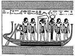 the forms of Horus, who is occupied in tying loops of rope to the elongated hawk-headed rowlocks in which the paddles may be worked. The boat of AF follows in the train of three boats, which may be thus described:--