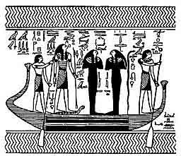 The third boat is called PA-KHET, "The Branch," and each end terminates in the head of a lion. In the middle of it stands the form of Osiris, who is called SHEFSHEF, and he wears on his head a pair of ram's horns; his arms and the upper