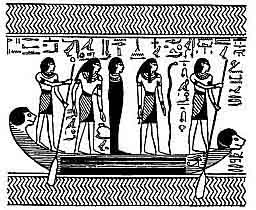 i.e., "The boat which capsizeth"; it contains three hawk-headed forms of the god Horus, and is steered by two male figures, who stand one in the bows and the other at the stern. In the middle of the boat stand the hawk-god BAK, and the hawk-goddess BAKET, and behind them, standing on a snake, is the