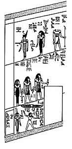 3, 4. Thoth, ibis-headed, and Horus, hawk-headed, standing facing each other, with the UTCHAT, above their outstretched hands and arms; the title of Thoth is UTHESU, i.e., "the Raiser," and that of Horus is AU-AU or, "the wide of hands." The Utchat is called SEKRI.