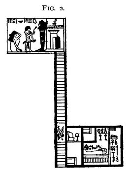 spreading out in everlastingness, lord of adorations, chief of the company of his gods; and hail, Anubis [dweller] in the tomb, great god, chief of the holy dwelling. May they grant that I may go into and come out from the underworld, that I may follow Osiris in all his festivals at the beginning of the year, that I may receive cakes, and that I may go forth into the presence of [Osiris]; I, the double (ka) of Osiris, the greatly favoured of his god, Hu-nefer." In the upper register of this section of the papyrus is the text of the "Chapter of opening the mouth of the statue of Osiris." The complete scene, including this stele and vignette, appears in the tomb of Pe-ta-Amen-Apt. In the vignette of the first chapter of the Book of the Dead in the papyrus of Neb-qet[1] the soul of the deceased is represented descending the steps of the tomb to carry food to its mummy in the underground chamber (Fig. 2).