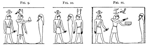 unto thee thy son who loveth thee; he shall open for thee thy mouth and thine eyes." (Fig. 8). A tomb-official, Am-as, then takes up his position behind the deceased, and the Se-mer-f and the Kher-heb stand in front; the Kher-heb repeating four times: "The Se-mer-f openeth the mouth and the two eyes of the deceased, first with a needle of iron, then with a rod of smu metal"; the Am-as addressing the deceased: "Behold the Se-mer-f"; and the Kher-heb saying, in the name of the Se-mer-f: "I have pressed for thee thy mouth, even as thy father pressed it in the name of Seker. Hail, Horus hath pressed thy mouth for thee, he hath opened thine eyes for thee; Horus hath opened thy mouth for thee, he hath opened for thee thine eyes; they are firmly stablished. Thy mouth was closed; I have ordered thy mouth and thy teeth for thee in their true order. Thou hast [again] opened thy mouth; Horus hath opened thy mouth. I have stablished thy mouth firmly. Horus hath opened for thee thy mouth, Horus hath opened for thee thy two eyes." The Kher-heb then speaks on behalf of the Sem priest: "Thy mouth was closed up. I have ordered aright for thee thy mouth and thy teeth. Thy mouth is firmly stablished. Thy mouth was tightly closed. His mouth is firmly stablished, and [his] two eyes are firmly stablished." The Sem priest next presents to the deceased (Fig. 9) a cone-shaped offering,[2] and at the same time the Kher-heb says: "Open the mouth and the two eyes, open the mouth and the two eyes. Thou hadst tightly closed thy mouth, thou hast [again] opened thy two eyes." Then the Kher-heb says, on behalf of the Smer (Fig. 10) priest who stands behind the deceased: