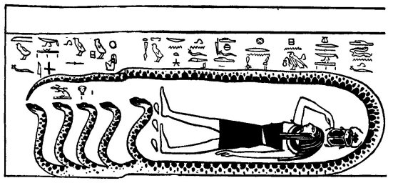 monster serpent "AM-KHU," i.e., "Eater of the Spirits," whose duty it is to devour the shadows of the dead, and to eat up the spirits of the foes of Ra; from his back spring the heads of the Four Children of Horus, and they come into being when they hear the voice of AFU-RA. Beyond these are four Osiris forms, "which stand though they are seated, and move though they are motionless," and nine serpents armed with knives, which represent the ancient gods, TA-THENEN, TEMU, KHEPERA, SHU, SEB, ASAR (OSIRIS), HERU, APU, and HETEPUI. These gods had faces of fire, and lived in the water of TATHENEN, and they only came to life by virtue of the words of power of AFU-RA, who is now to be regarded as KHEPERA.