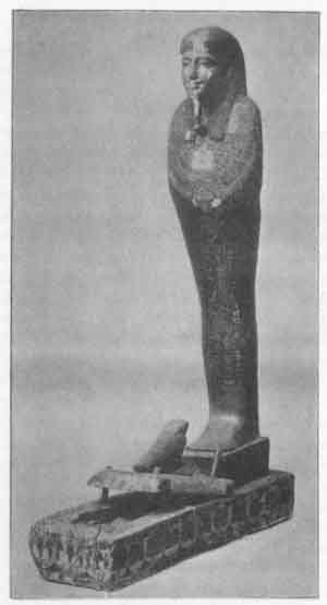 of the new life which the Egyptian hoped to live in the world beyond the grave. But the difficulty was how to obtain the protection of Ptah, Seker, and Osiris, and how to make them do for the man that which they did for themselves, and so secure their attributes. To attain this end a figure was fashioned in such a way as to include the chief characteristics of the forms of these gods, and was inserted in a rectangular wooden stand which was intended to represent the coffin or chest out of which the trinity Ptah-Seker-Ausar came forth. On the figure itself and on the sides of the stand were inscribed prayers on behalf of the man for whom it was made, and the Egyptian believed that these prayers caused the might and powers of the three gods to come and dwell in the wooden figure. But in order to make the stand of the figure as much like a coffin as possible, a small portion of the body of the deceased was carefully mummified and placed in it, and it was thought that if the three gods protected and preserved that piece, and if they revivified it in due season, the whole body would be protected, and preserved, and revivified. Frequently, especially in the late period, a cavity was made in the side of the stand, and in this was laid a small roll of papyrus inscribed with the text of certain Chapters of the Book of the Dead, and thus the deceased was provided with additional security for the resurrection of his spiritual body in the world to come. The little rolls of papyrus