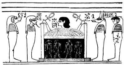 Osiris rising from the funeral chest holding the symbol of "life" In each hand.