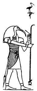 the field, became an important god; and as the owner's name was carved upon it, he was the god of letters and of all learning. He has the head of an ibis, because the ibis perches on the top of the post. He is often in the act of writing, or of counting the years on the notches at the back of a palm branch from which the leaves have been broken off (see Fig. 12). This palm branch is the hieroglyphical character for the word "year." Thoth was by the Greeks called Hermes, a name which has the same meaning, a pillar. The sacred books of the priests were all supposed to have been written by Thoth.
