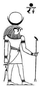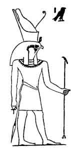 In the western half of the Delta the Sun was worshipped as Mando-Ra. Like Amun-Ra, he wears the two tall feathers, and the Sun on his head, but he differs from him in having a hawk's face (see Fig. 3). In our woodcuts these gods each carry in their left hand a staff, with an animal's head, and in the right hand the character for life. A cow's tail, the ornament of royalty, hangs down behind from the waistband. After the fall of the kings of Thebes we find a violent attempt was made by the kings of the city of Mendes to introduce into Thebes the worship of Mando-Ra, in place of Amun-Ra.