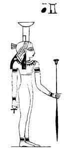 Isis, or Isitis, the Earth, or rather the corn-bearing Land, the mother of all creation, was another and perhaps the chief favourite with the nation. Her name is derived from SAT, to sow seed, like the Latin Ceres. She is known by the throne upon her head, because a throne forms the first syllable of her name (see Fig. 9). But she had so many