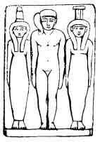 is Osiris, Isis, and Horus, a group, indeed, common to most parts of Egypt. Other groups were Isis, Nephthys, and Horus (see Fig. 22); or Isis, Nephthys, and Osiris; and with a national love for mysticism the priests often declared that the three in some undescribed way only made one person. The above figures, indeed, do not declare that the three gods are only one; but we have a hieroglyphical inscription in the British Museum as early as the reign of Sevechus of the eighth century before the Christian Era, showing that the doctrine of Trinity in Unity already formed part of their religion, and stating that in each of the two groups last mentioned the three gods only made one person (Egypt. Inscript. Pl. 36, 4, 5).