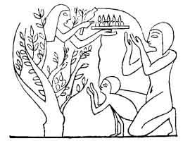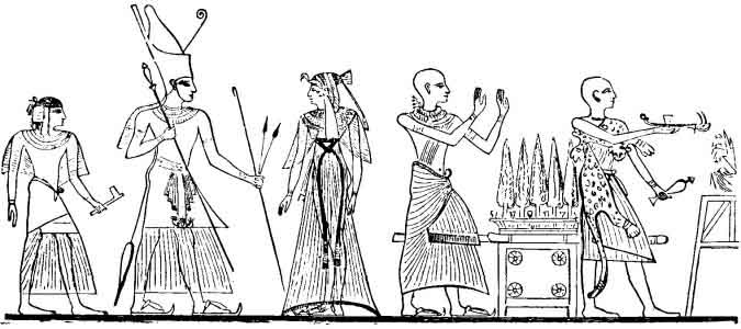 From a pious regard to those that gave them birth, the Egyptians paid some kind of inferior worship to their father and mother when dead, and to all their forefathers. They dutifully set out food for the use of these dead relations in the neighbourhood of the tombs, and their doing so was carefully mentioned on their own funeral tablets as an act which, like the worship of the gods, they had not neglected in their lifetime. The sculpture which shows the dead man on his knees presenting his offerings to the gods, shows him standing to present the same offerings to his ancestors. When he brings fire and water to the one, he does the same to the others. Such food would soon be devoured by the beasts and birds of the desert; and in the inscriptions Anubis the jackal is called the devourer of what is set out for the dead. The Egyptian superstitions are usually forbidden in the Mosaic Law, and in Deut. xxvi. 13, 14., we see that the Israelites were forbidden to set apart any food for the dead.