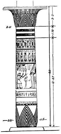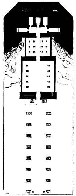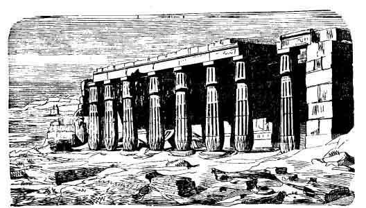 The Egyptians were of a gloomy, serious disposition, and they worshipped in fear rather than in gratitude. Their prayers and sacrifices were sin-offerings rather than thank-offerings. The architecture of their temples was in harmony with their religion. The inner sanctuary, the holy of holies, was always a dark room. Fig. 31 is the ground plan of the temple of Errebek in Thebes, built by Oimenepthah I., and finished by his son Rameses II. The worshippers were allowed to enter a first courtyard, and a second courtyard through gateways formed of massive towers. An avenue between two rows of sphinxes brought them to the portico, under which the sacrifices and libations were made in their sight and on their behalf. But none