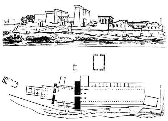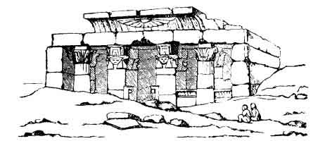 Memnonium built by, Rameses IL, and that at Medinet Habou, built by Rameses III., were not open to the eyes of the people in the courtyard like that at Errebek. These newer temples had a low wall running, from column to column, which shut out the public from seeing what took place within. The laity were left to imagine the solemnities which their fathers had been allowed to gaze at. This is well shown in the ruined temple of Contra-Latopolis, which was built under the later Ptolemies (see Fig. 35). It is still better shown in Fig. 36, a restoration of the Temple