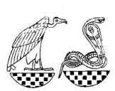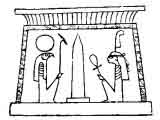 Over the portico of the Theban temple there is usually a ball or sun, ornamented with outstretched wings, representing the all-seeing Providence thus watching over and sheltering the world. From this sun hang two sacred asps wearing the crowns of Upper and Lower Egypt (see Fig. 1).