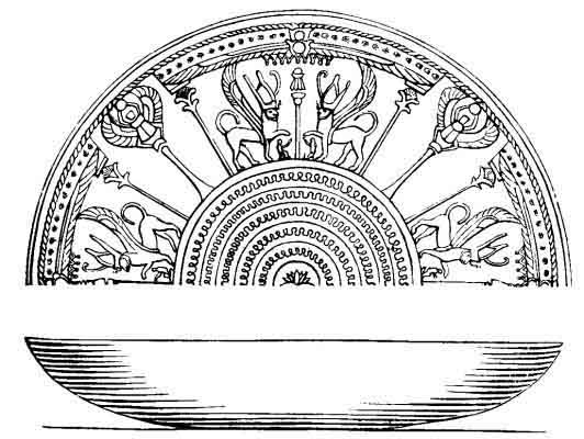 the funeral Ceremony. It thus crossed the stream which divided life from death, and entered the region of Amenti, the abode of the dead. If the death took place on the west side of the river, the same procession by water was conducted across the small lake or large tank, which belonged to the temple. It was not unusual to have a small model of this sacred tank, with its flights of steps leading down to the water, cut in stone, to be used as a basin for the libations in the temple (see Fig. 69). When