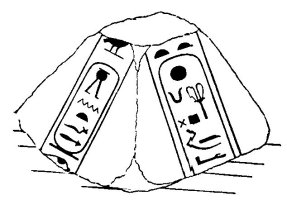 The offerings set out upon the altars for gods and ancestors were for the most part the articles of food which were eaten by the living; such as the head of a calf, the leg of a stag, a craw-fish, a loaf of bread, and various vegetables. At other times it was a cone of baked clay with a religious sentence stamped on the base, or a small stone pyramid with an inscription on each of the four sides (see Fig. 59). These were used as figurative of any gift, in consequence of the close resemblance of the words TEI, a gift, and TAU, a hill. On some occasions the priest presented fire and water to the statues of the gods as being the two purest of the elements. The water, or occasionally wine, was poured out of a tall slender jar, while a small quantity of burning charcoal was held forward in a metal ladle with a long handle to it (see Fig. 60), where we have figures of the king, the queen, and their son attending upon two priests, who are making the offerings. We