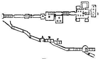 In Fig. 62 we have the ground plan and the vertical section of the tomb of king Oimenephah I., in the valley of kings' tombs at Thebes. When the entrance had been discovered, and eighteen feet of earth had been removed by the enterprising Belzoni, he descended through staircases and passages for about 120 feet further, till he arrived at a pit or dry well, which was thirteen feet across, and thirty feet deep, marked A in our plan.