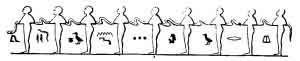 The jar or bottle carried by the prophet, the third in the group, was supposed to have the power of speaking. This priest, by his skill in ventriloquism, made his hearers believe that his voice came out of it. The same speaking bottle was made use of by the Hebrew ventriloquists, who said that a familiar spirit dwelt in it. Such was used by the witch of Endor when she played upon the feelings of King Saul (see 1 Sam. xxviii., in the Hebrew).