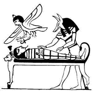 The goddess Isis and Nephthys were more particularly supposed to grieve at every man's death (see Fig. 67), and the god Anubis to assist in laying out the mummy. It was always placed on a lion-shaped couch (see Fig. 68). When placed in the mummy-case, as the death may have taken place on the east side of the Nile, while the burial places were usually on the west side, the ferrying it across the river was an important part of