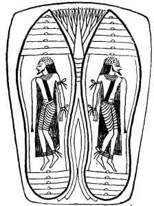the outer case, whether a first, second, or third, was shaped to the body, it was sometimes placed upon its feet upright against the wall. We learn from the arrangement of the sculpture on the outer case whether it was meant to stand up or to lie down. The inscriptions on these cases usually declare the pedigree of the deceased person through two, three, or four generations, and add a variety of religious sentences in honour of the several gods, whose figures are there painted or sculptured, and tell us that he was