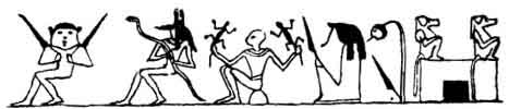 Lower Egypt. The Cynocephalus, or dog-faced monkey, plays an important part in the world below, and among the spirits of the dead. Four of these usually guard the bottomless pit of hell fire, sitting one at each corner of it, as in Fig. 79. On the papyri they join the souls of the departed in worshipping the sun, when on its journey under ground, after sinking into the arms of the ocean; and when they accompany the boa' of Ra, as on the tablet (Egypt Inscript., pl. 46), we must suppose that the god is then on its midnight passage through the valley of the shadow of death.