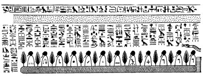 [paragraph continues] Tuat." Along the front of the twelve shrines stretches an enormous serpent, the duty of which is to protect those who stand in them. Beyond the shrines is a long basin or lake of boiling water, with rounded ends, in which stand up to their waists twelve mummied gods, with black heads, who either have white bodies, or are arrayed in white apparel; in front of each god grows a large ear of wheat. These gods are described as "the gods in the boiling lake." The texts which relate to both groups of beings are as follows:--