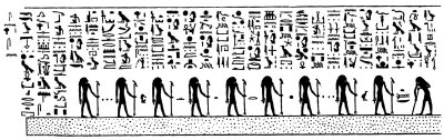 in a similar attitude, and before him stand nine gods, each holding the symbol of life in the right hand, and the sceptre in the left; the nine gods are called "Nebu khert," i.e., Lords of destinies.