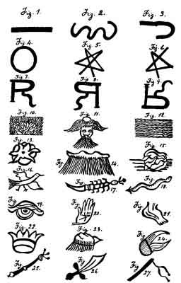 The book itself, which is quite informally written, falls into several divisions. There is, firstly, an elaborate treatise on the method of extracting the names of the good and evil spirits referred to the seven planets. This is a further development of a subject treated at some length in the third book of Occult Philosophy. The method is of no importance to our inquiry, but those who have sought to unravel it confess that they have been baffled. I ask leave to assure my readers that I have not emulated their zeal by seeking to follow in their footsteps, and, so far as I am concerned, the method therefore remains in the bosom of its proper mystery. Possibly Agrippa and his successor were only fooling their readers, and did not disclose the secret. The treatise on Names is followed by one upon Characters and, depending as it does from the first, this is also not readily intelligible. I have left it to those whom it may concern. Thereafter comes a formal tabulation of all the known shapes familiar to the spirits of the planets, followed by a disquisition upon Pentacles and Sigils, another upon the consecration of instruments used in magical ceremonies, as also of fire, water and so forth. The work concludes with methods for