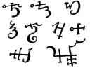 After sunrise, a black cock must be killed, the first feather of its left wing being plucked and preserved for use at the required time. The eyes must be torn out, and so also the tongue and heart; these must be dried in the sun and afterwards reduced to powder. The remains must be interred at sunset in a secret place, a cross of a palm in height being set upon the mound, while at each of the four corners the signs which here follow must be drawn with the thumb:--