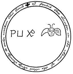 [paragraph continues] Requisites: coal, and consecrated chalk to compose the circle, about which these words must be written: I forbid thee, Lucifer, in the name of the Most Holy Trinity, to enter within this circle. A mouse must be provided to give him; the master must have a stole and holy water, an alb also and a surplice. He must recite the Conjuration in a lively manner, commanding sharply and shortly, as a lord should address his servant, 1 with all kinds of menaces: SATAN, RANTAM, PALLANTRE, LUTAIS,