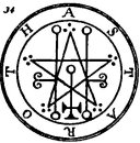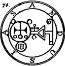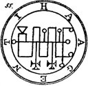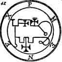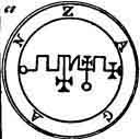a Viper in his hand. His Office is to discover Things Hidden, Witches, Wizards, and Things Present, Past, and to Come. He, at the command of the Exorcist will build Towers, overthrow Great Stone Walls, and make the Waters rough with Storms. He governeth 36 Legions of Spirits. And his Seal is this, which wear thou, as aforesaid, etc.