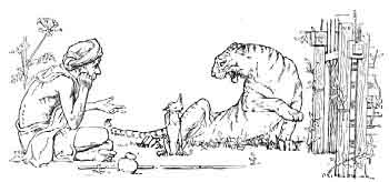 Now when the tiger sobbed and sighed and wept and swore, the pious Brahman's heart softened, and at last he consented to open the door of the cage. Out popped the tiger, and, seizing the poor man, cried, "What a fool you are! What is to prevent my eating you now, for after being cooped up so long I am just terribly hungry!"