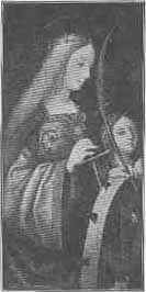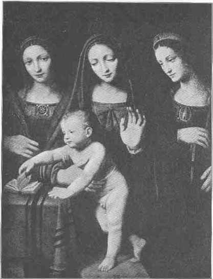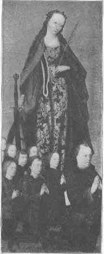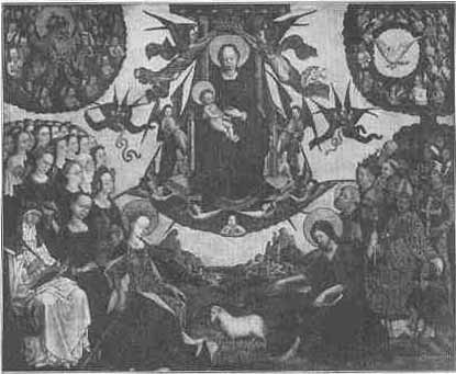 In a painting called "The Glorification of the Virgin" an unknown master of the German school presents us with a general view of the Christian world-conception of his age. In the heavens appears the Trinity. In the center God the Son is represented as the Christ-child in the arms of his mother, while on her right is God the Father and on her left the Holy Ghost. Below on earth the male saints are headed by John the Baptist, while St. Catharine takes the leadership of the female saints.
