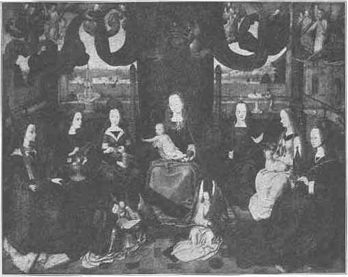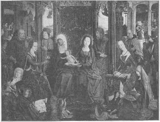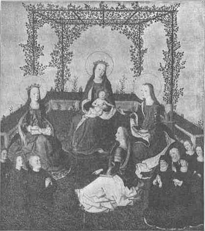Another artist, known as the Master of the Life of Mary, places the scene of the mystic marriage into a gracefully blossoming arbor, the foliage of which is so ideally sparse as to indicate very early springtime. Here too the features of all the saints are genuinely Teutonic, exhibiting the self-satisfied complacency of wealthy patricians, while the modest donors with their austere faces are crowded into the corners.
