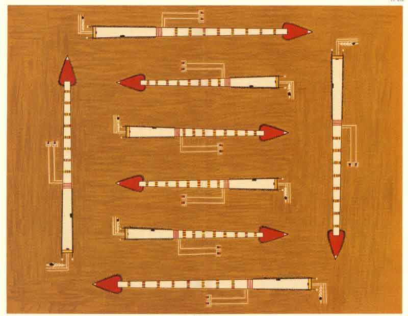 174. The FOURTH PICTURE represents the kátso-yisçàn, or great arrows are the especial great mystery, the plumed arrows. These potent healing charm of this dance. The picture is supposed to be a facsimile of a representation of these weapons, shown to the prophet when be visited the abode of the Tsilkè-¢igìni, or young men gods, where he first saw the arrows (paragraph 47). There are eight arrows. Four are in the center, lying parallel to one another--two pointing east and two others, alternate, pointing west. The picture is bordered by the other four, which have the same relative positions and directions as the bounding serpents in the first picture. The shafts are all of the same white tint, no attention being paid to the colors of the cardinal points; yet in drawing and erasing the picture the cardinal points are duly honored. Among the central arrows, the second from the top, or north margin of the design, is that of the east; it is drawn and erased first. The next below it is the arrow of the south; the third is that of the west. The one on top belongs to the north; it is drawn and erased last. The heads are painted red to represent the red stone points used; the fringed margins show the irregularities of their edges. The plumes at the butt are indicated, as us also the strings by which the plumes are tied on and the notches to receive the bowstring.