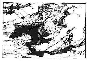 "Hie over cap!" said Guleesh; and on the moment the horse rose under him, and cut a leap in the clouds, and came down in Erin.