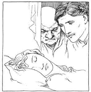 himself on the bed and fell asleep again, for the force of the herb was not all spent, and he passed another day and a night sleeping. When he woke up he went back to the priest's house, and found that the young lady was in the same state, and that she was asleep almost since the time that he left the house.